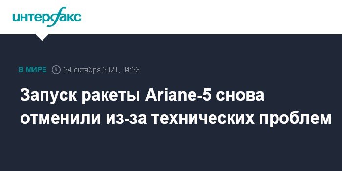 Москва. 24 октября. INTERFAX.RU - Запуск тяжелой ракеты-носителя Ariane-5 Европейского космического агентства (ESA) с двумя спутниками связи, планировавшийся в воскресенье, был отменен за семь минут до старта из-за технических проблем. Об этом сообщила французская компания-оператор Arianespace.