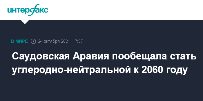 Москва. 24 октября. INTERFAX.RU - Саудовская Аравия, один из крупнейших мировых производителей нефти, пообещала снизить выбросы парниковых газов в атмосферу до нуля к 2060 году.