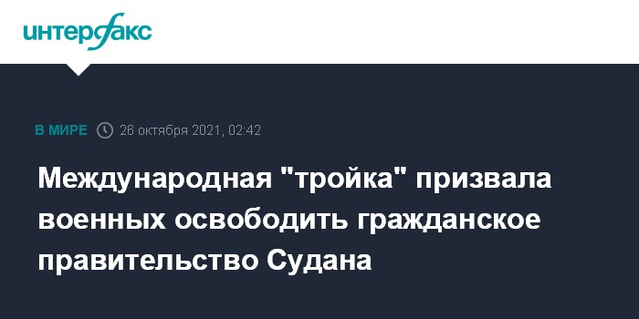 Москва. 26 октября. INTERFAX.RU - Международная "тройка" - США, Великобритания и Норвегия - обеспокоена ситуацией в Судане и призывает военных освободить представителей гражданского правительства.