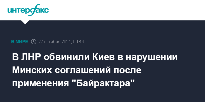 Москва. 27 октября. INTERFAX.RU - В Луганске обвинили украинских военных в нарушении Минских соглашений в связи с применением Вооруженными силами Украины в Донбассе боевого беспилотника турецкого производства "Байрактар".