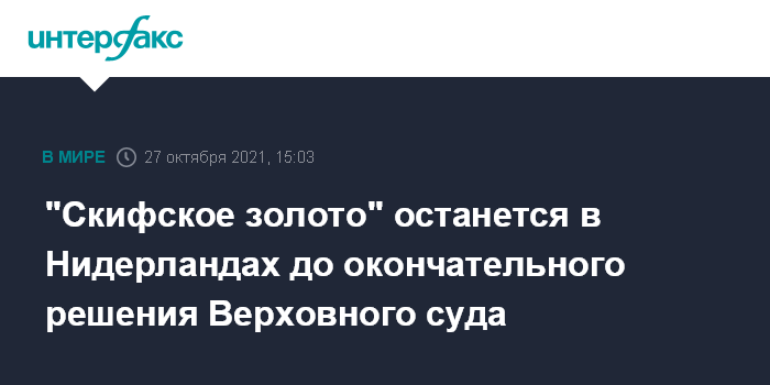 Москва. 27 октября. INTERFAX.RU - "Скифское золото" пока останется в Нидерландах, поскольку на решение амстердамского апелляционного суда может быть подана апелляция в Верховный суд Нидерландов, сообщил "Интерфаксу" пресс-секретарь университета Амстердама Яша Ланге.