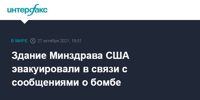 Москва. 27 октября. INTERFAX.RU - Здание министерства здравоохранения и социальных служб США в Вашингтоне эвакуировали, а ближайшие улицы оцепили в связи с угрозой взрыва бомбы, сообщает в среду издание The Hill.