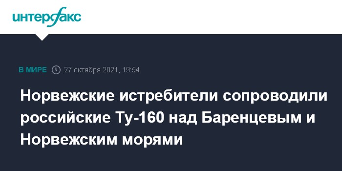 Москва. 27 октября. INTERFAX.RU - Норвегия поднимала в воздух истребители F-16 из-за полета двух российских стратегических бомбардировщиков Ту-160 над Баренцевым и Норвежским морями, сообщили в Минобороны РФ.