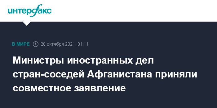 Москва. 28 октября. INTERFAX.RU - Министры иностранных дел соседних с Афганистаном стран, включая Иран, Китай, Пакистан, Таджикистан, Туркменистан, Узбекистан и Россию, выступили с совместным заявлением, в котором подчеркивается, что единственное решение проблем Афганистана - это всеобъемлющая политическая структура с участием всех этнических групп, сообщило иранское агентство IRNA.