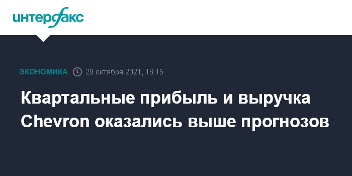 Москва. 29 октября. INTERFAX.RU - Одна из крупнейших нефтяных компаний США Chevron Corp. в третьем квартале 2021 года вернулась на прибыльный уровень, при этом скорректированная прибыль и выручка существенно превзошли прогнозы на фоне скачка цен на нефть и природный газ.