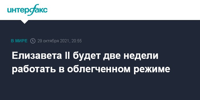 Москва. 29 октября. INTERFAX.RU - Королева Великобритании Елизавета II в соответствии с рекомендациями медиков как минимум две недели будет работать в облегченном режиме, сообщили в пятницу в Букингемском дворце.