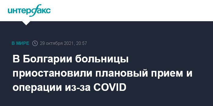 Москва. 29 октября. INTERFAX.RU - Власти Болгарии приняли решение о приостановке планового приема пациентов и операций в больницах страны в связи с переводом медицинских учреждений на борьбу с коронавирусом COVID-19, сообщает в пятницу Associated Press.