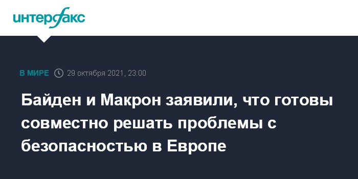 Москва. 29 октября. INTERFAX.RU - Президент США Джо Байден и президент Франции Эммануэль Макрон по итогам переговоров в Риме заявили о готовности работать вместе над решением проблем с безопасностью в Европе, говорится в совместном заявлении двух лидеров, распространенным Белым домом по итогам встречи.