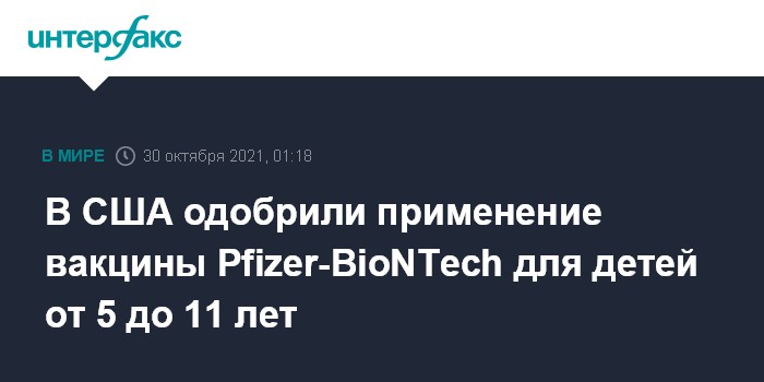 Pfizer и BioNTech заявили, что их вакцина против COVID-19 более чем на 90 % эффективна для защиты детей в возрасте от 5 до 11 лет от коронавируса, согласно исследованию, опубликованному FDA на прошлой неделе. Препарат предусматривает введение двух уколов с интервалом в три недели. Доза вакцины должна составлять 10 микрограммов по сравнению с 30 микрограммами, используемыми для людей 12 лет и старше.