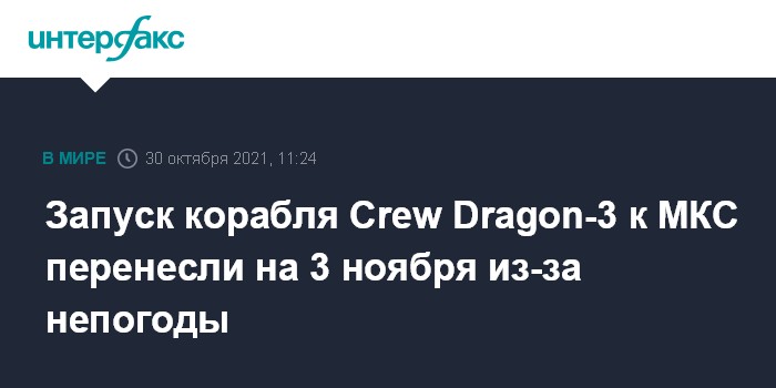 Москва. 30 октября. INTERFAX.RU - В связи с неблагоприятными погодными условиями запуск пилотируемого корабля Crew Dragon-3 американской компании SpaceX к Международной космической станции, который планировалось осуществить в воскресенье, перенесен на 3 ноября, сообщило в субботу НАСА.