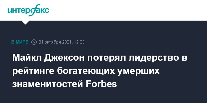 Москва. 31 октября. INTERFAX.RU - Майкл Джексон (1958-2009) потерял первое место в рейтинге Forbes среди умерших знаменитостей, чье наследие продолжает приносить доход. Он неизменно возглавлял рейтинг с 2013 года, но в 2021 году опустился на третье место.