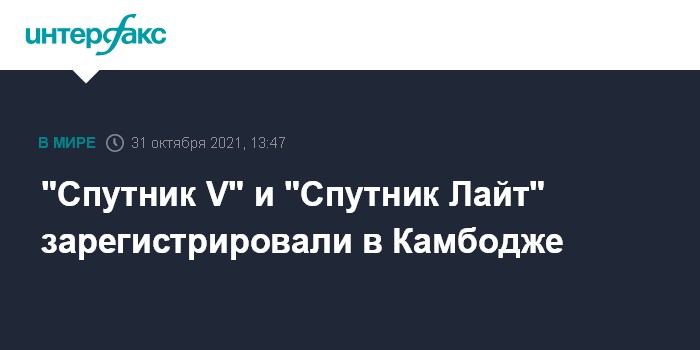Москва. 31 октября. INTERFAX.RU - Российские вакцины против коронавируса "Спутник V" и "Спутник Лайт" зарегистрированы для применения в Камбодже, сообщил в воскресенье Российский фонд прямых инвестиций (РФПИ).