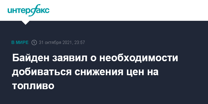 Москва. 31 октября. INTERFAX.RU - Президент США Джо Байден в воскресенье не согласился с идеей, что сохранение высоких цен на нефть и горючее - это хорошо, так как подтолкнет к использованию "зеленых" энергоресурсов.