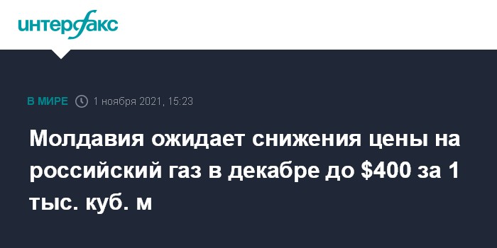 Москва. 1 ноября. INTERFAX.RU - Цена на российский газ для Молдавии в декабре 2021 года может составить менее $400 за 1 тысячу кубометров против порядка $450 за 1 тысячу кубометров в ноябре, сообщил вице-премьер Молдавии, министр инфраструктуры и регионального развития Андрей Спыну.