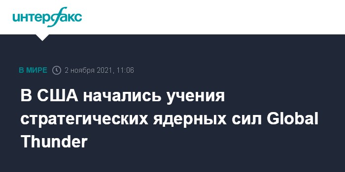 Москва. 2 ноября. INTERFAX.RU - В Соединенных Штатах начались ежегодные учения Global Thunder, во время которых проверяется готовность стратегических ядерных сил, сообщило Стратегическое командование США.
