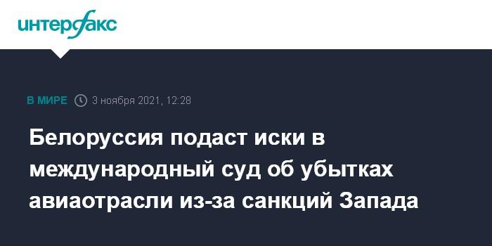 Москва. 3 ноября. INTERFAX.RU - Авиационные власти Белоруссии намерены в перспективе обратиться в международный суд с исками о взыскании убытков и упущенной выгоды в связи с санкциями ЕС и других стран, сообщил директор департамента по авиации Минтранса Белоруссии Артем Сикорский.