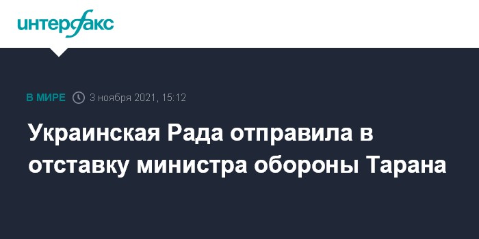 Москва. 3 ноября. INTERFAX.RU - Верховная рада Украины поддержала отставку Андрея Тарана с должности министра обороны по его заявлению.