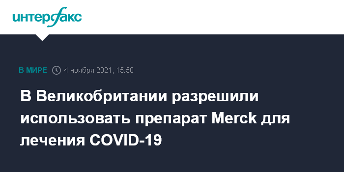 Москва. 4 ноября. INTERFAX.RU - Британское агентство по регулированию лекарственных средств одобрило применение препарата молнупиравир американской компании Merck для лечения коронавируса у взрослого населения страны.