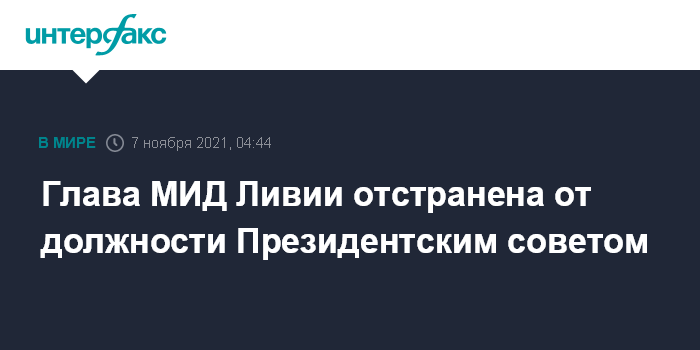Москва. 7 ноября. INTERFAX.RU - Президентский совет Ливии в минувшую субботу отстранил от выполнения обязанностей министра иностранных дел и международного сотрудничества страны Наджлу Мангуш, сообщила пресс-секретарь Совета Наджва Вахиба.