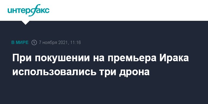 Москва. 7 ноября. INTERFAX.RU - В ходе покушения на премьера Ирака Мустафу аль-Каземи в воскресенье утром были задействованы три беспилотника, сообщили местные СМИ со ссылкой на МВД республики.