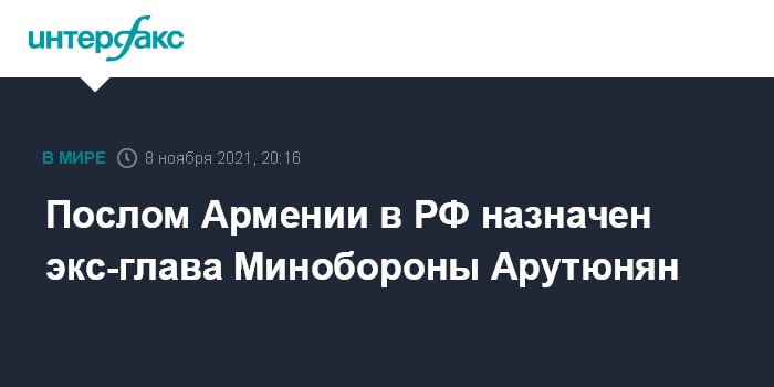 Москва. 8 ноября. INTERFAX.RU - Бывший министр обороны Армении Вагаршак Арутюнян назначен послом республики в России, сообщило армянское издание "168 часов" со ссылкой на источники.