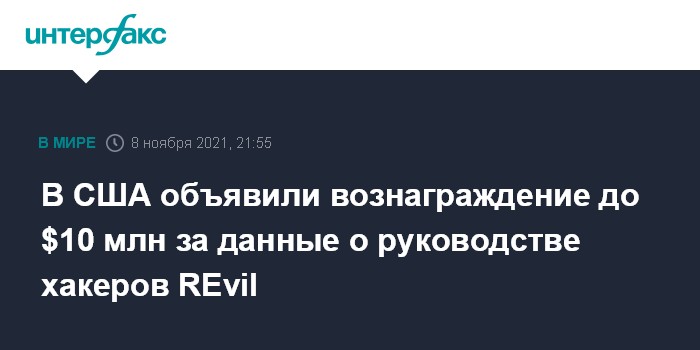 Москва. 8 ноября. INTERFAX.RU - Госдеп США предлагает вознаграждение в размере до $10 млн за информацию о руководителях хакерской группировки Sodinokibi, которая также известна как REvil, сообщил в понедельник пресс-секретарь американского ведомства Нед Прайс.