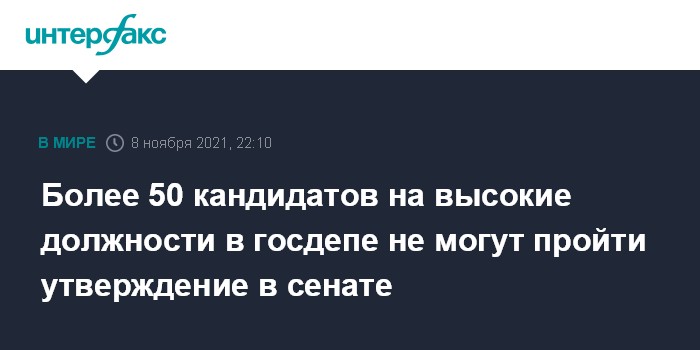 Москва. 8 ноября. INTERFAX.RU - Республиканцы в сенате США продолжают блокировать процесс утверждения кандидатов на высокие должности в госдепе, в результате чего свыше 50 человек в настоящее время ожидают, когда их кандидатура будет одобрена, пишет в понедельник The Hill.
