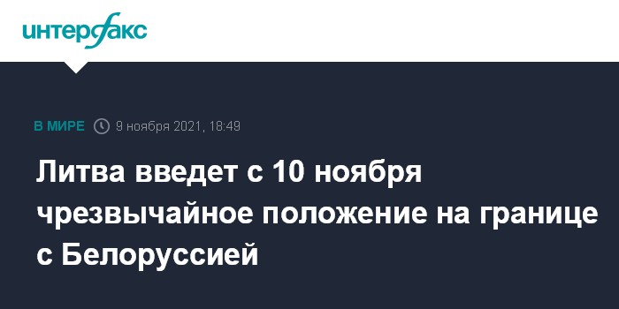 Москва. 9 ноября. INTERFAX.RU - Сейм Литвы решил ввести чрезвычайное положение на границе с Белоруссией с полуночи 10 ноября из-за попыток мигрантов прорваться с белорусской территории. Один депутат проголосовал против, 122 были за.