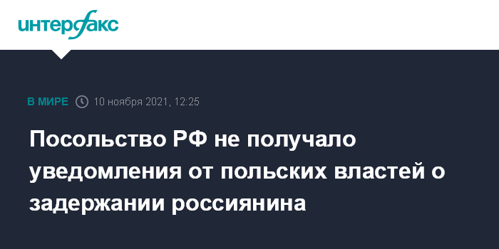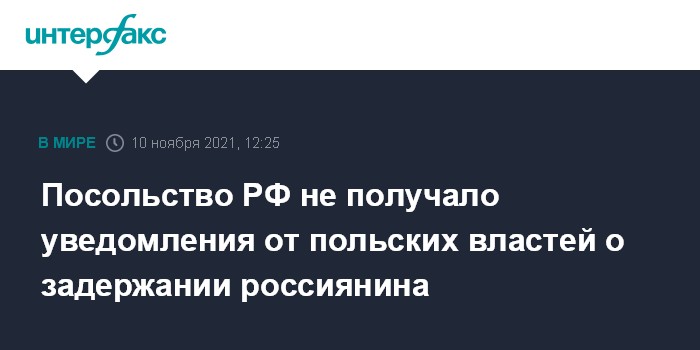 Москва. 10 ноября. INTERFAX.RU - Польская сторона еще не информировала дипломатов о задержании гражданина России по делу о пособничестве нелегальной миграции через границу с Белоруссией, сообщил пресс-секретарь российского посольства в Варшаве Владимир Александров.