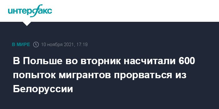 Москва. 10 ноября. INTERFAX.RU - Нелегальные мигранты за вторник, 9 ноября, предприняли 599 попыток перехода границы из Белоруссии в Польшу, сообщили в Погранслужбе Польши.