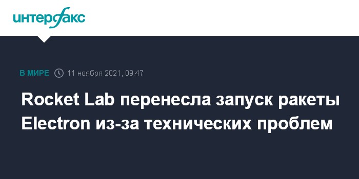 Москва. 11 ноября. INTERFAX.RU - Запуск ракеты Electron с двумя спутниками дистанционного зондирования Земли (ДЗЗ) американской компании геопространственной разведки BlackSky, который планировался в четверг, перенесен в связи с техническим проблемами, сообщила компания-разработчик носителя Rocket Lab.