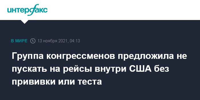 Москва. 13 ноября. INTERFAX.RU - 36 американских конгрессменов обратились к президенту США Джо Байдену с письмом, в котором призвали сделать обязательной вакцинацию против COVID-19 для всех пассажиров внутренних авиарейсов или обязать их предъявлять отрицательный тест на коронавирус. Об этом в своем твиттере сообщил один из подписантов, член Палаты представителей Дон Байер.