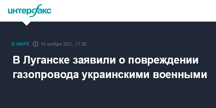 Москва. 14 ноября. INTERFAX.RU - Газопровод поврежден в результате обстрела подконтрольного самопровозглашенной Луганской народной республике поселка Ломоватка со стороны ВС Украины, сообщили в пресс-службе государственного унитарного предприятия ЛНР "Лугансказ".