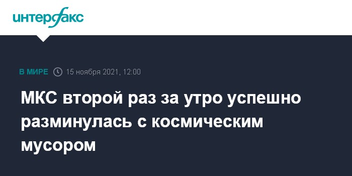 Москва. 15 ноября. INTERFAX.RU - Международная космическая станция (МКС) вновь успешно разминулась с космическим мусором, станция и экипаж не пострадали, следует из трансляции NASA.