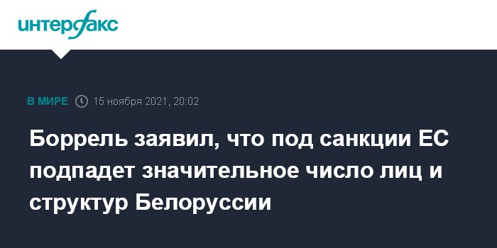 Москва. 15 ноября. INTERFAX.RU - Новый пакет санкции против Белоруссии затронет значительное количество физических и юридических лиц, его окончательно сформируют в ближайшие дни, сообщил в понедельник глава дипломатии ЕС Жозеп Боррель.
