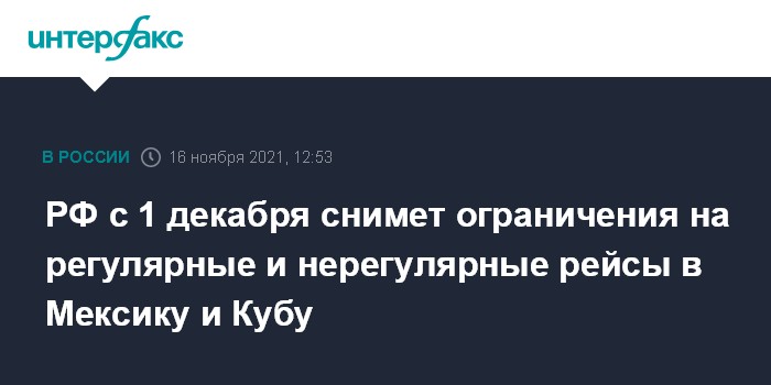 РФ с 1 декабря снимет ограничения на регулярные и нерегулярные рейсы в Мексику и Кубу