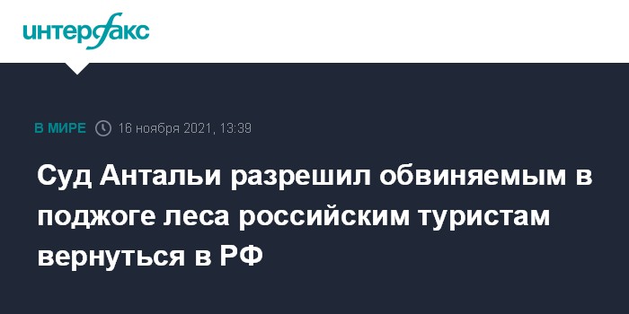 Москва. 16 ноября. INTERFAX.RU - Суд турецкой Антальи снял запрет на выезд с российских туристов, обвиняемых в поджоге леса, теперь они могут вернуться в Россию, сообщил "Интерфаксу" вице-президент российского подразделения Международного комитета защиты прав человека Иван Мельников.
