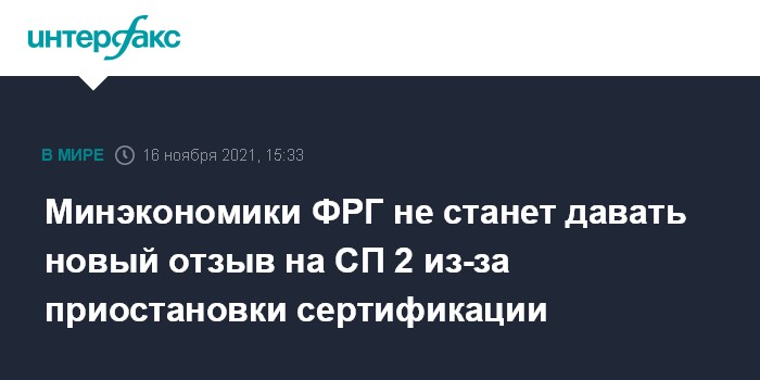 Москва. 16 ноября. INTERFAX.RU - Минэкономики ФРГ не придется готовить новый отзыв на "Северный поток 2" из-за приостановки сертификации газопровода, достаточно прежнего документа, сообщила во вторник "Интерфаксу" представитель пресс-службы министерства Сюзанне Унград.