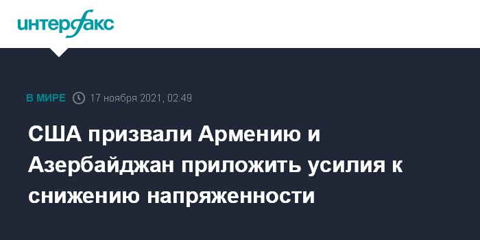 Москва. 17 ноября. INTERFAX.RU - Соединенные Штаты выразили обеспокоенность обострением ситуации в районе границы между Арменией и Азербайджаном и призвали к усилиям, направленным на предотвращение эскалации напряженности.