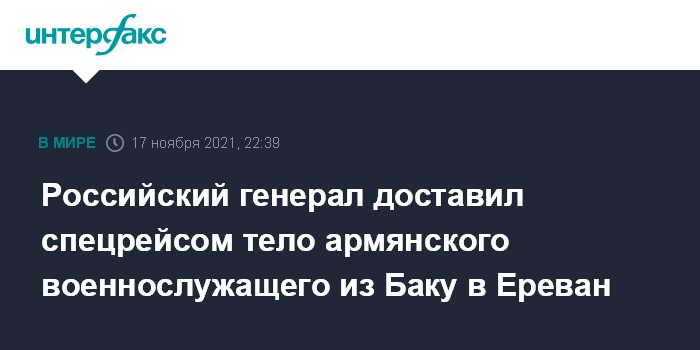 "Вечером 17 ноября заместитель командующего Южным военным округом генерал-лейтенант Рустам Мурадов спецбортом доставил из Баку в Ереван тело одного военнослужащего ВС Армении, погибшего в результате боев 16 ноября", - сообщает пресс-служба Минобороны.