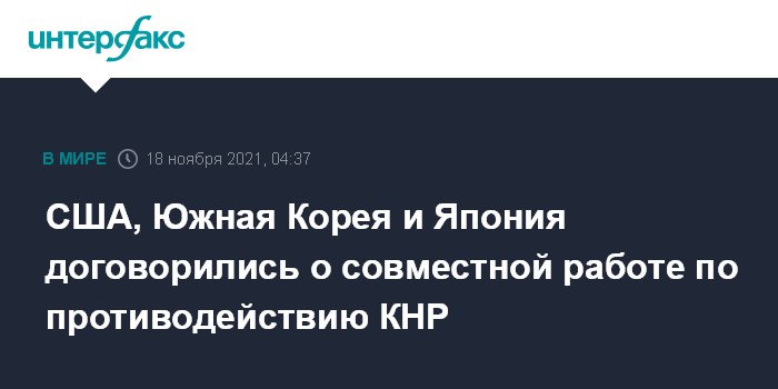 Москва. 18 ноября. INTERFAX.RU - Заместитель госсекретаря США Уэнди Шерман заявила, что на состоявшейся в Вашингтоне встрече с заместителями глав МИД Южной Кореи Чхве Чон Куном и Японии Такэо Моди стороны подтвердили готовность к совместной работе по противодействию Китаю, когда его политика угрожает миру и глобальной безопасности.
