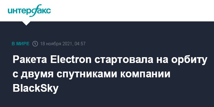 Москва. 18 ноября. INTERFAX.RU - Ракета Electron в четверг стартовала из Новой Зеландии на орбиту с двумя спутниками дистанционного зондирования Земли (ДЗЗ) американской компании геопространственной разведки BlackSky, сообщила компания-разработчик носителя Rocket Lab.