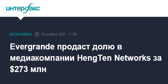 Москва. 18 ноября. INTERFAX.RU - Один из крупнейших китайских застройщиков China Evergrande Group, столкнувшийся с серьезными долговыми проблемами, продаст принадлежащую ему долю в медиакомпании HengTen Networks Group Ltd. за 2,13 млрд гонконгских долларов ($273 млн).