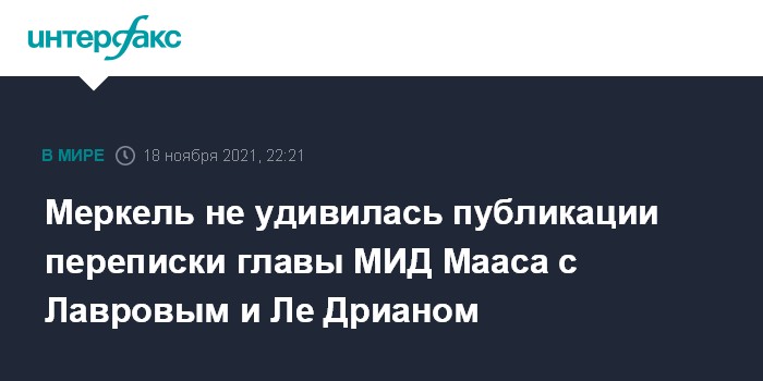 Москва. 18 ноября. INTERFAX.RU - И.о. канцлера ФРГ Ангела Меркель заявила, ее не удивило решение российского МИД опубликовать переписку Сергея Лаврова с немецким и французским коллегами Хайко Маасом и Жан-Ивом ле Дрианом.