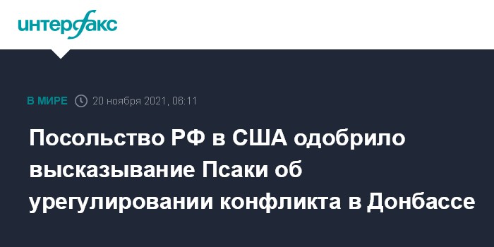 Москва. 20 ноября. INTERFAX.RU - Посольство РФ в США заявило, что приветствует заявление пресс-секретаря Белого Дома Джен Псаки о поддержке наращивания усилий по урегулированию конфликта в Донбассе в соответствии с Минскими соглашениями.