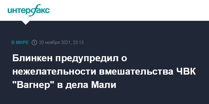 Москва. 20 ноября. INTERFAX.RU - Мали является важным элементом безопасности региона, и вмешательство ЧВК "Вагнер" и прочих внешних сил в дела этой страны не принесет пользы, заявил в ходе визита в Сенегал госсекретарь США Энтони Блинкен.