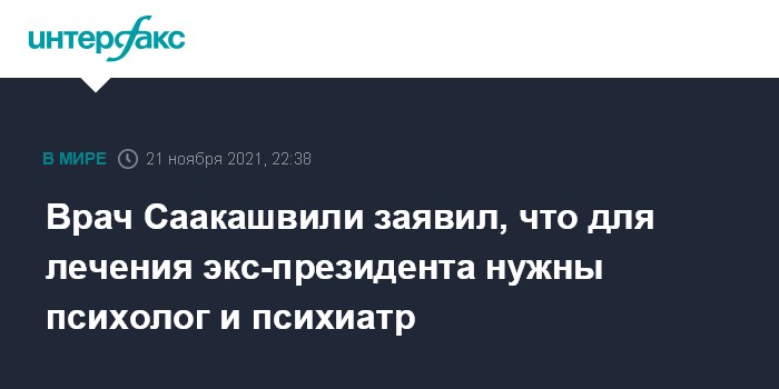 Москва. 21 ноября. INTERFAX.RU - Личный врач бывшего президента Грузии Михаила Саакашвили Николоз Кипшидзе считает, что в процессе лечения политика потребуется помощь психолога и психиатра.