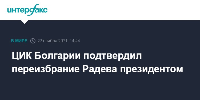 Москва. 22 ноября. INTERFAX.RU - Центральная избирательная комиссия Болгарии в понедельник подтвердила победу действующего президента страны Румена Радева во втором туре выборов главы государства, сообщает Болгарское национальное телевидение.