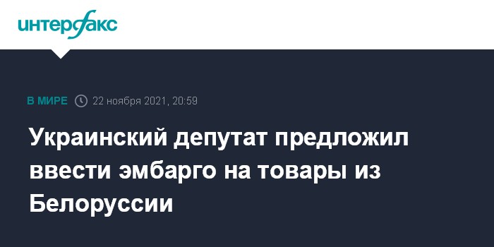 Москва. 22 ноября. INTERFAX.RU - Народный депутат фракции "Слуга народа" в Верховной раде Украины Александр Дануца предлагает парламенту законодательно установить эмбарго на товары происхождением из Белоруссии, следует из зарегистрированного им в Раде законопроекта №6329.
