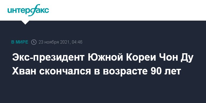 Москва. 23 ноября. INTERFAX.RU - Бывший президент Южной Кореи Чон Ду Хван скончался во вторник, сообщает "Ренхап" со ссылкой на его помощников.